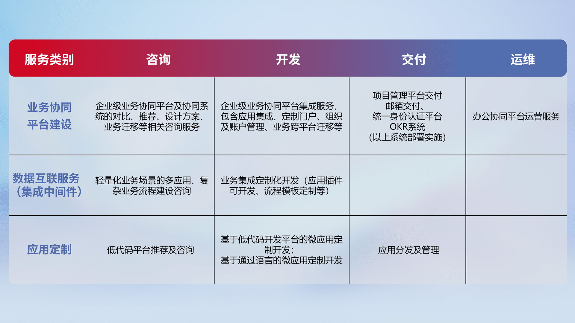 针对钉钉、、企微、、、、IDaas等平台级产品提供产品的规划、、方案、、交付、、定制化开发等服务,,实现如统一协同办公、、智能客户服务、、、混合会议管理、、、智能数据查询、、等业务场景,,,,实现数字化转型。。