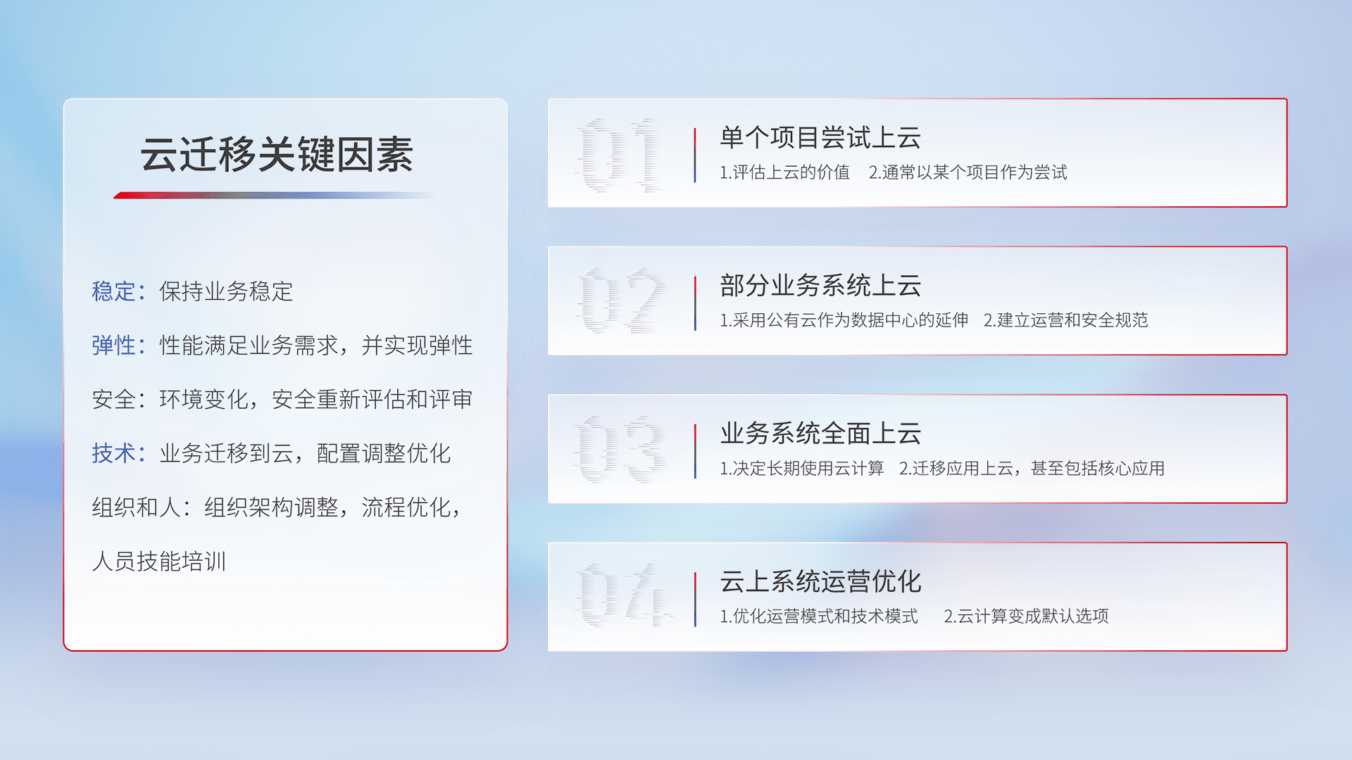 结合实际业务,,,从规划设计、、、云平台选型、、、、云原生改造、、、数据迁移、、、集成交付,,,迁移全过程为客户识别最佳上云路径,,,,做好风险识别管理,,,,设计网络架构、、、、身份权限、、、、安全审计合规、、、、操作审计、、、、日志审计、、监控告警策略、、、多站点容灾设计等,,对云上基础设施进行整体规划,,,,提升IT治理水平,,,,以满足弹性、、、高可用、、、高性能的需求。。。