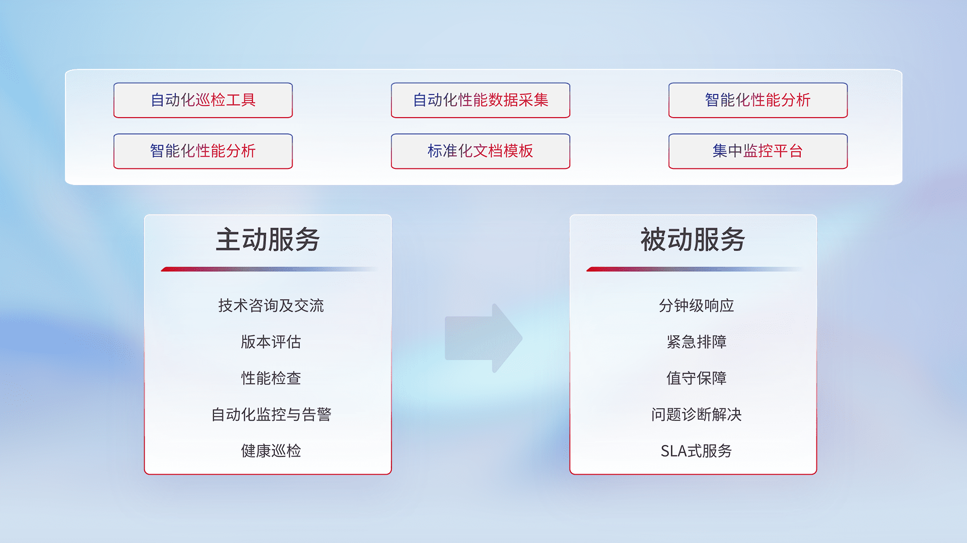 智能化工具和标准化文档,,,,保障服务质量,,,提供主动服务(包含技术咨询、、、、版本评估、、性能检查、、自动化监控与告警、、健康巡检)和被动服务包含(分钟级响应、、紧急排障、、值守保障、、、、问题诊断解决、、SLA服务)。。。