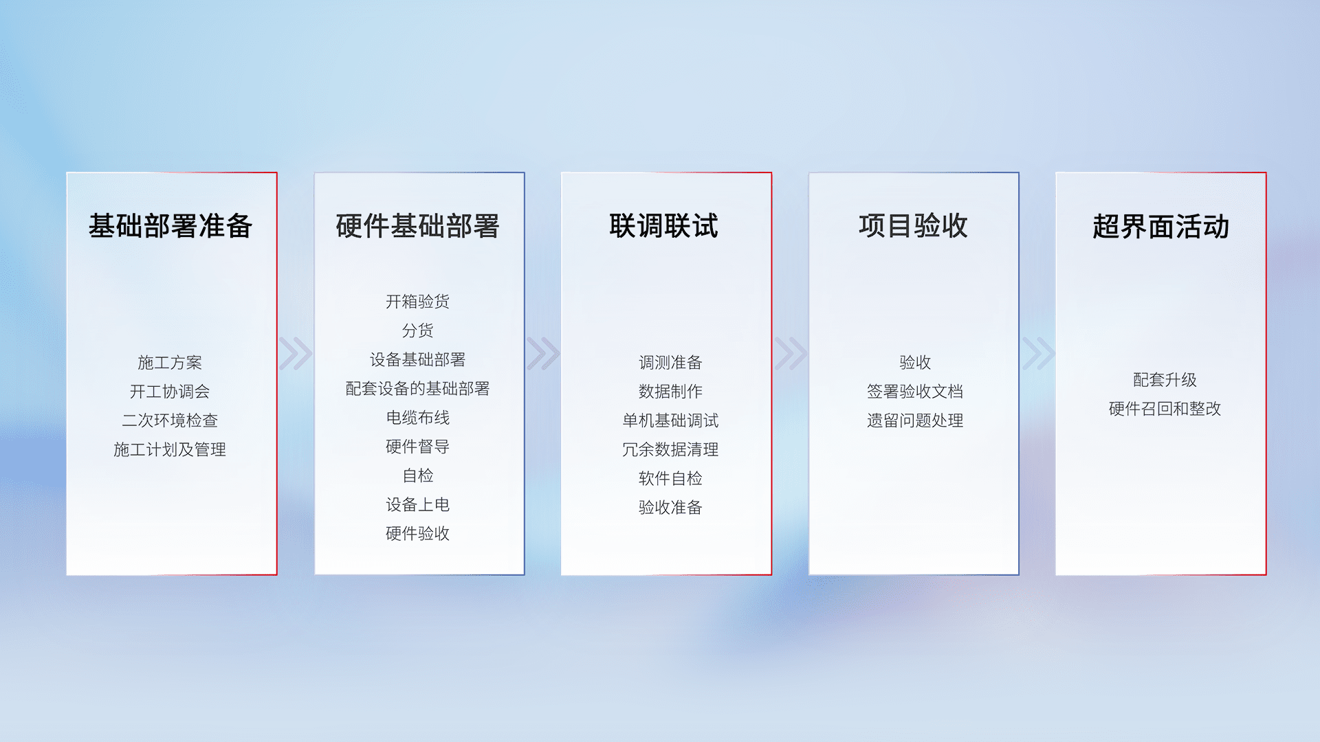 从基础部署准备、、、、硬件基础部署、、联调联试、、项目验收、、、、越界面活动的全过程可追溯,,,保证施工质量和进度。。